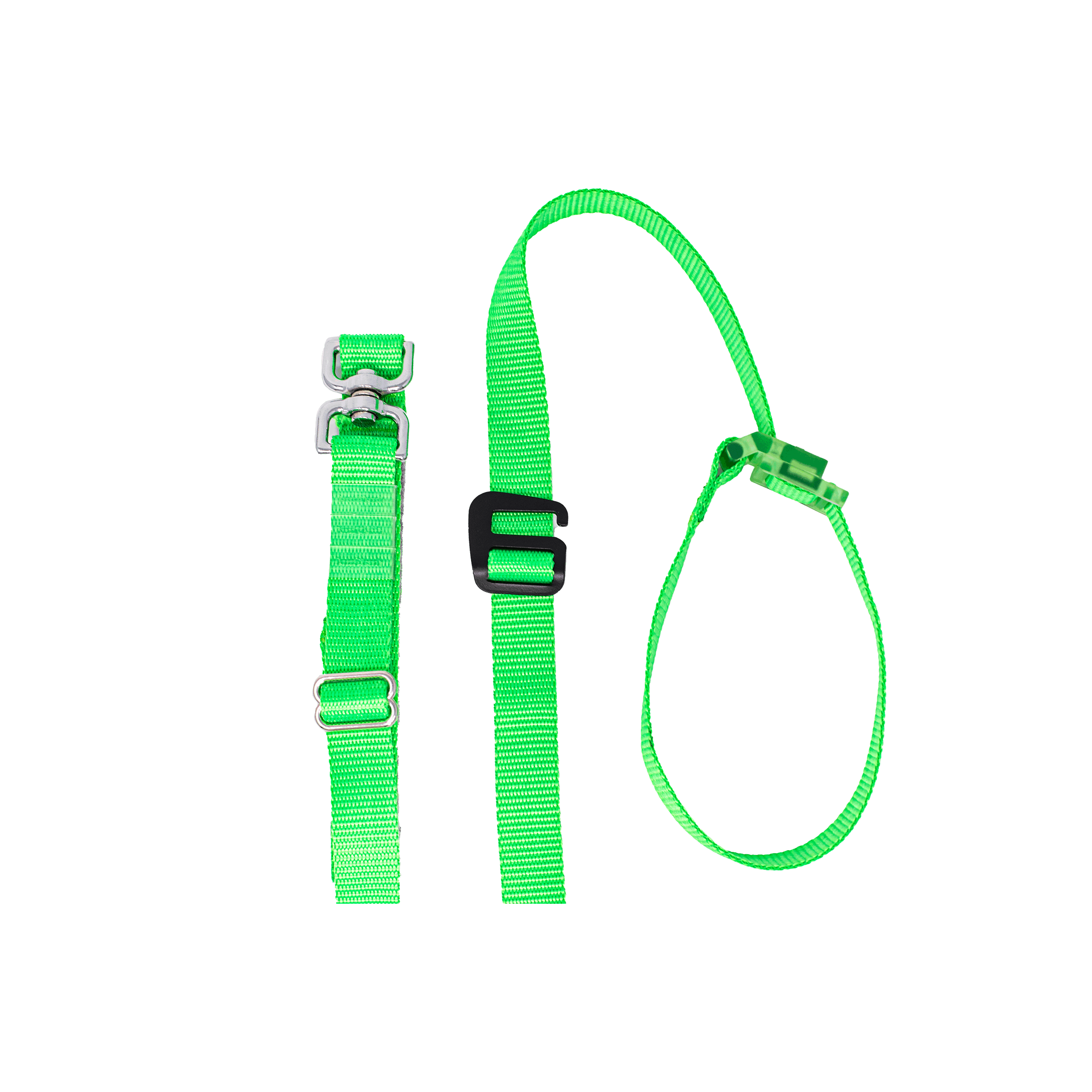 The wider part with two openings acts like a slide buckle to customize its position; it is intended for firm attachment to the webbing. The open end of the hook allows it to connect and disconnect by simply hooking/unhooking a LassOleash swivel handle.